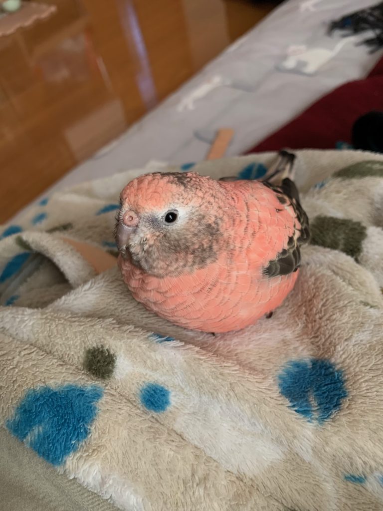 そんなあやめは、放鳥時にお世話係2号の脚にかかったポワポワの膝掛けに乗っかって休んでくれます。